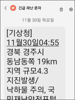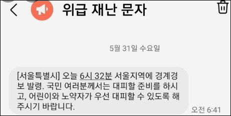 • 위급재난문자: 전시 상황, 공습경보, 화생방 경보, 규모 6.0 이상의 지진 등 위급한 상황에서 발송됩니다.