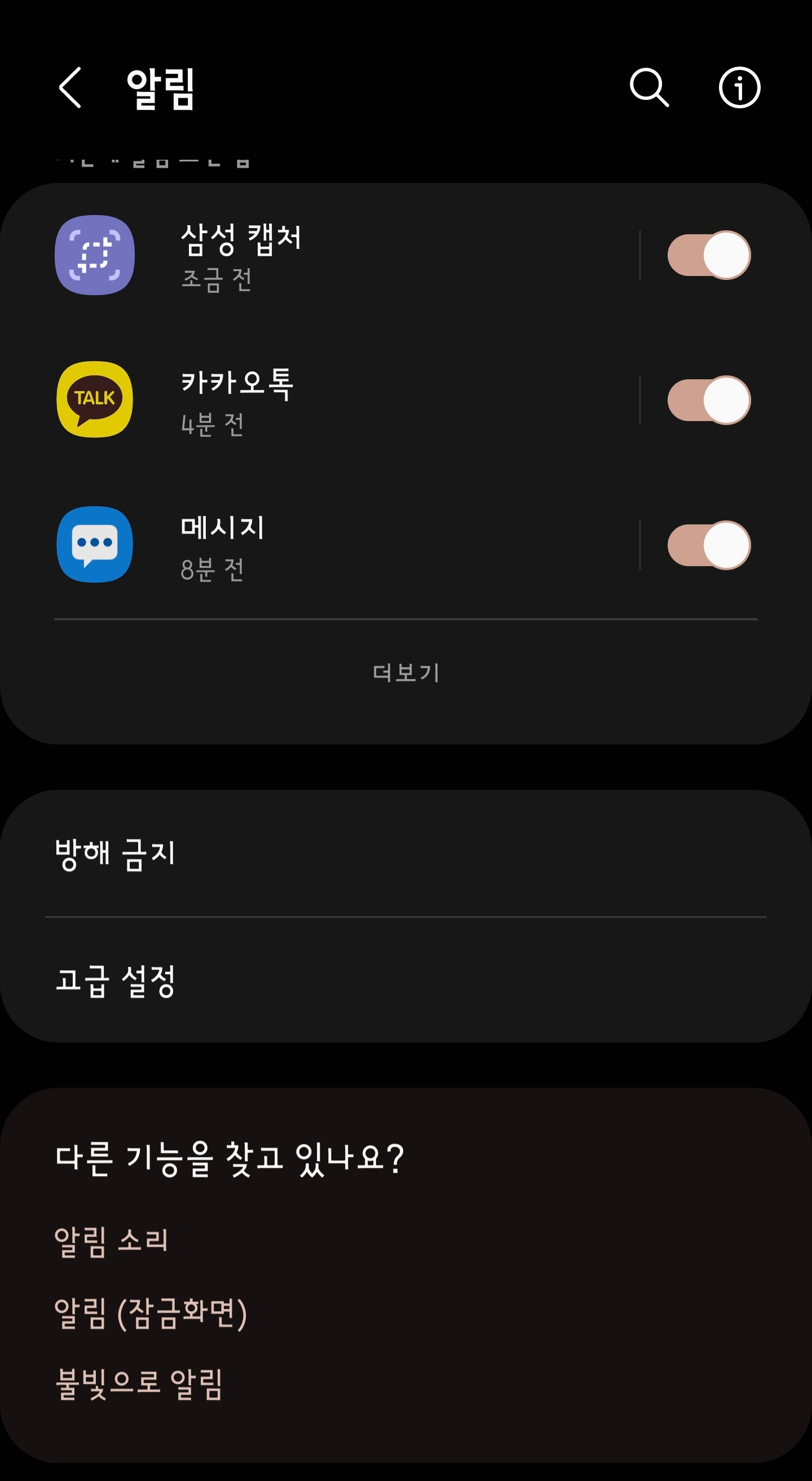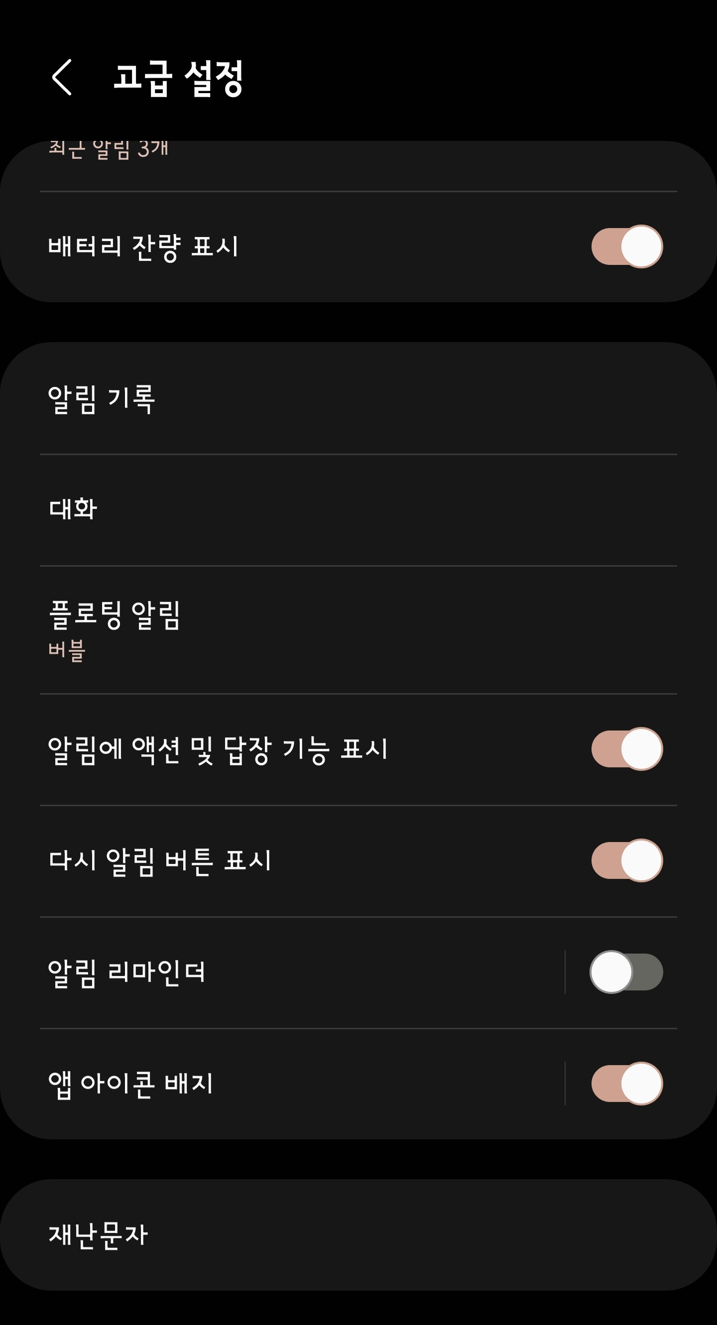 • 재난문자 설정: 하단으로 스크롤하여 '실종경보문자', '긴급재난문자', '안전안내문자' 설정 메뉴를 확인하고, 각각의 알림을 활성화 또는 비활성화합니다.