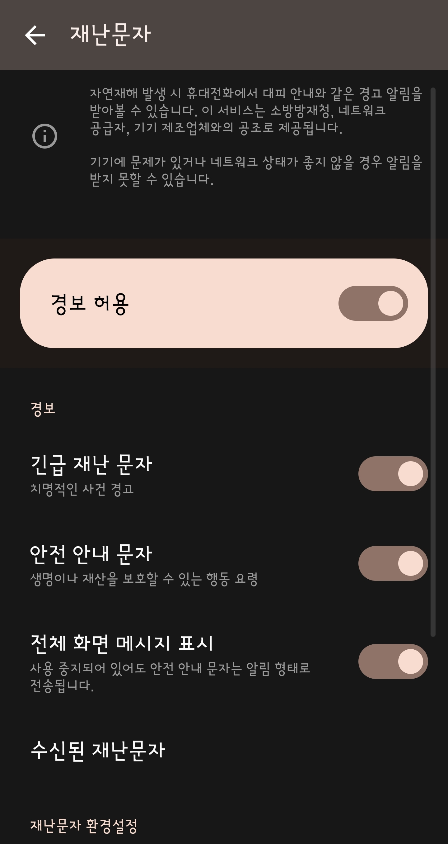 긴급재난문자와 안전안내문자는 설정을 통해 끄기/켜기가 가능하지만, 위급재난문자는 설정을 변경할 수 없습니다.