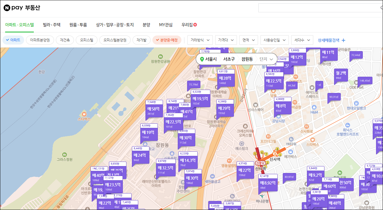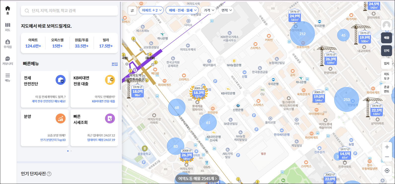 - 왼쪽에서 아파트 및 부동산 정보, 매물 정보 확인
